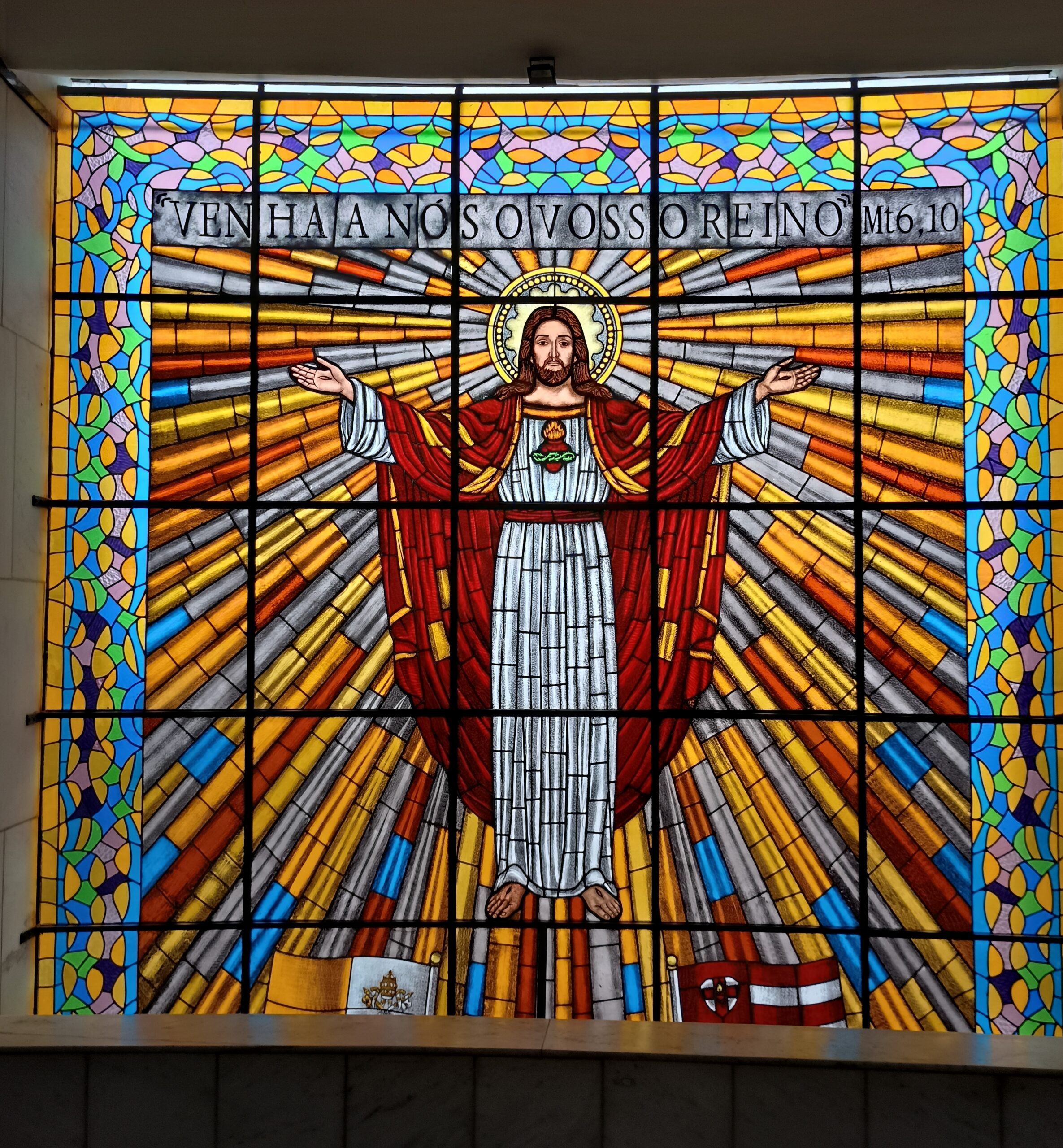 O vitral central apresenta a imagem do Sagrado Coração de Jesus de braços abertos, indicando o papel acolhedor do Santuário Basílica e a necessidade sempre presente de se cultivar este espírito de acolhida e misericórdia para com todos. Além disso, pretende-se expressar através da imagem de Jesus de corpo inteiro aquilo que significa a devoção ao Coração de Jesus. Não se trata de uma devoção apenas a uma parte de Jesus ou apenas a um órgão biológico. Mas, a devoção ao Coração de Jesus refere-se ao reconhecimento do Amor que a Pessoa inteira, divina e humana de Jesus, nutre por toda a Humanidade e pela Criação a ponto de transbordar. A respeito disso, diz o Evangelista João que: Jesus, “tendo amado os seus que estavam no mundo, amou-os até o fim” (Jo 13,1). Acima da imagem do Sagrado Coração de Jesus está inscrito o versículo bíblico “Venha a nós o Vosso Reino” (Mt 6,10), com o objetivo de recordar que cabe a todos os fiéis fazer sempre essa súplica, como rezamos no Pai Nosso, uma vez que esse é o sentido principal de uma Basílica.